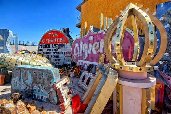 The Main Boneyard is where tours are always held, and where some of the signs are restored and lit. The main boneyard includes signs from places such the Stardust, Frontier, La Concha, and the Greek Isles.